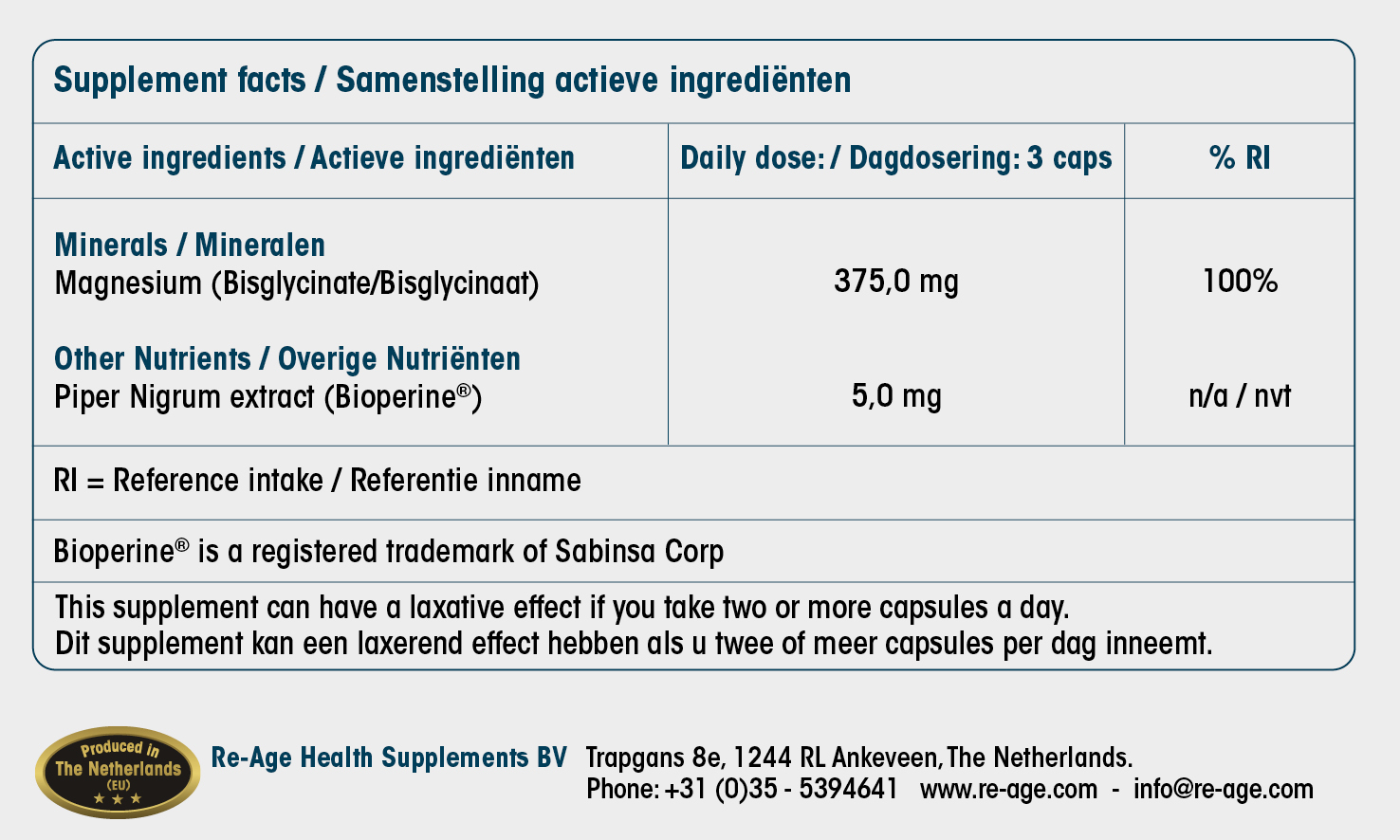 ReAge Magnesium heeft daarnaast een hoge biologische beschikbaarheid, mede door de toevoeging van Bioperine® (Piper Nigrum Extract). Bioperine® bevordert de opname van Magnesium.