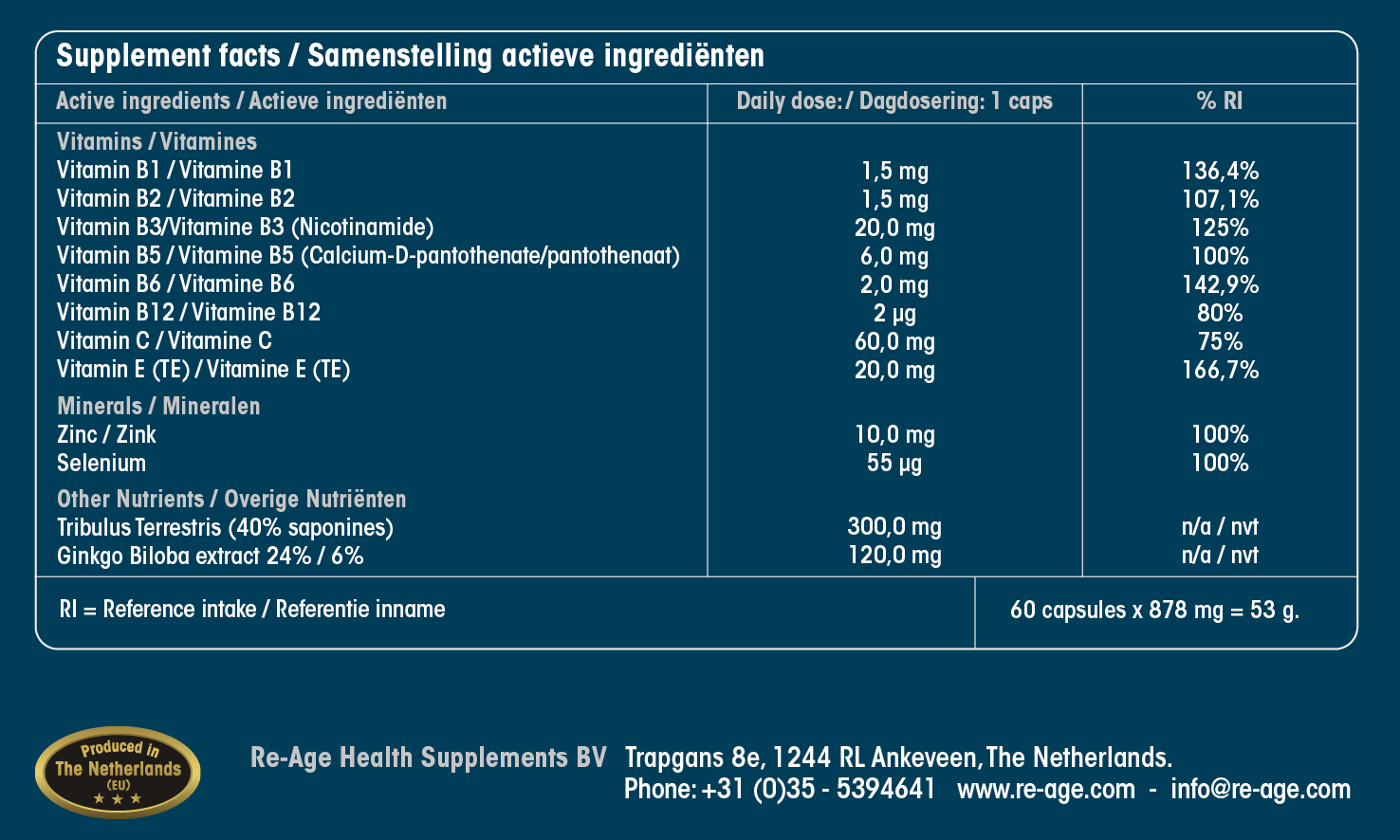 Besides a healthy, balanced diet and enough exercise ReAge highly recommends Male Factor 1, your first step in male support! It contains natural and effective ingredients that, amongst other important functions, can help in maintaining normal testosterone levels in the blood (Zinc) and regulate hormonal activity (B6).